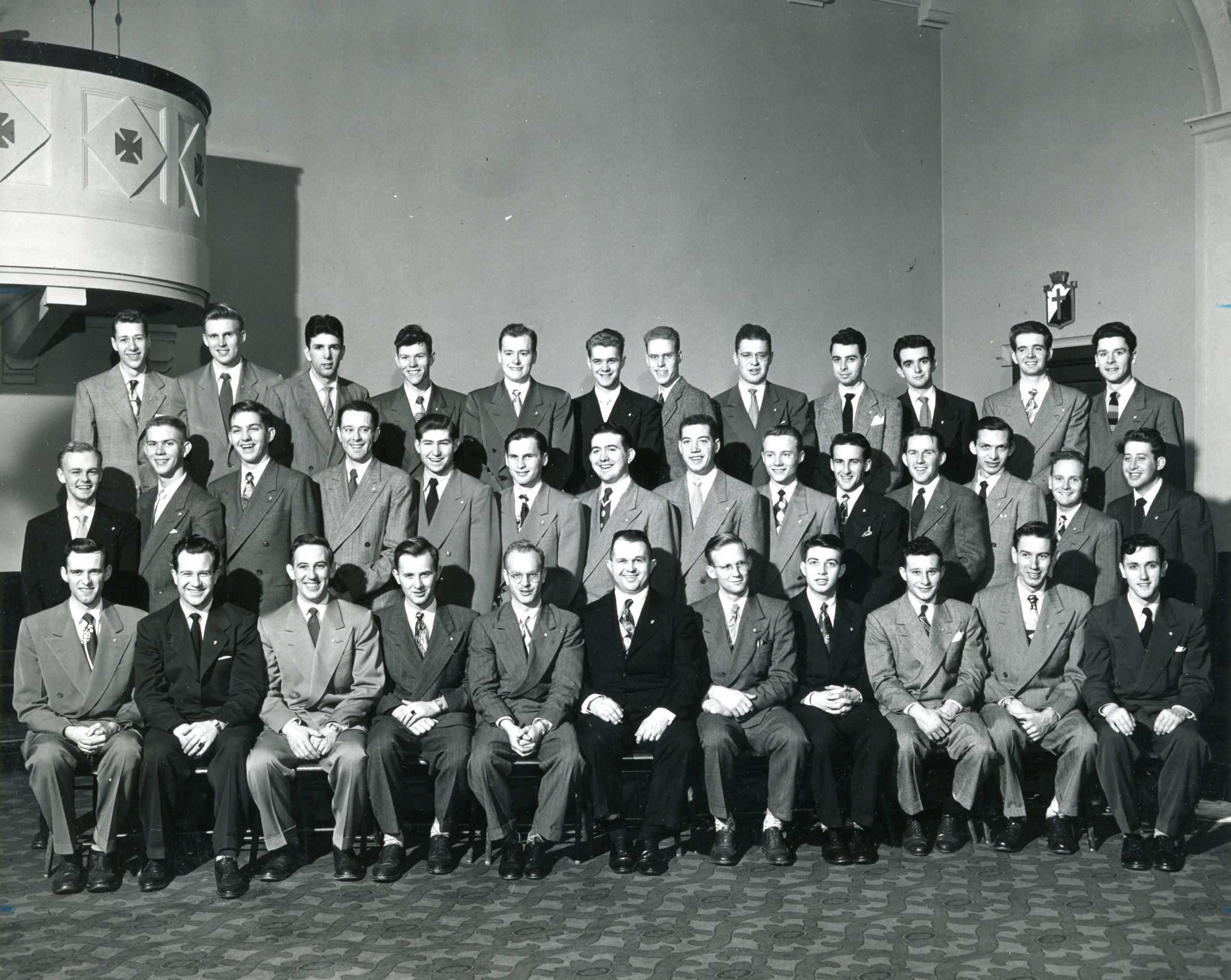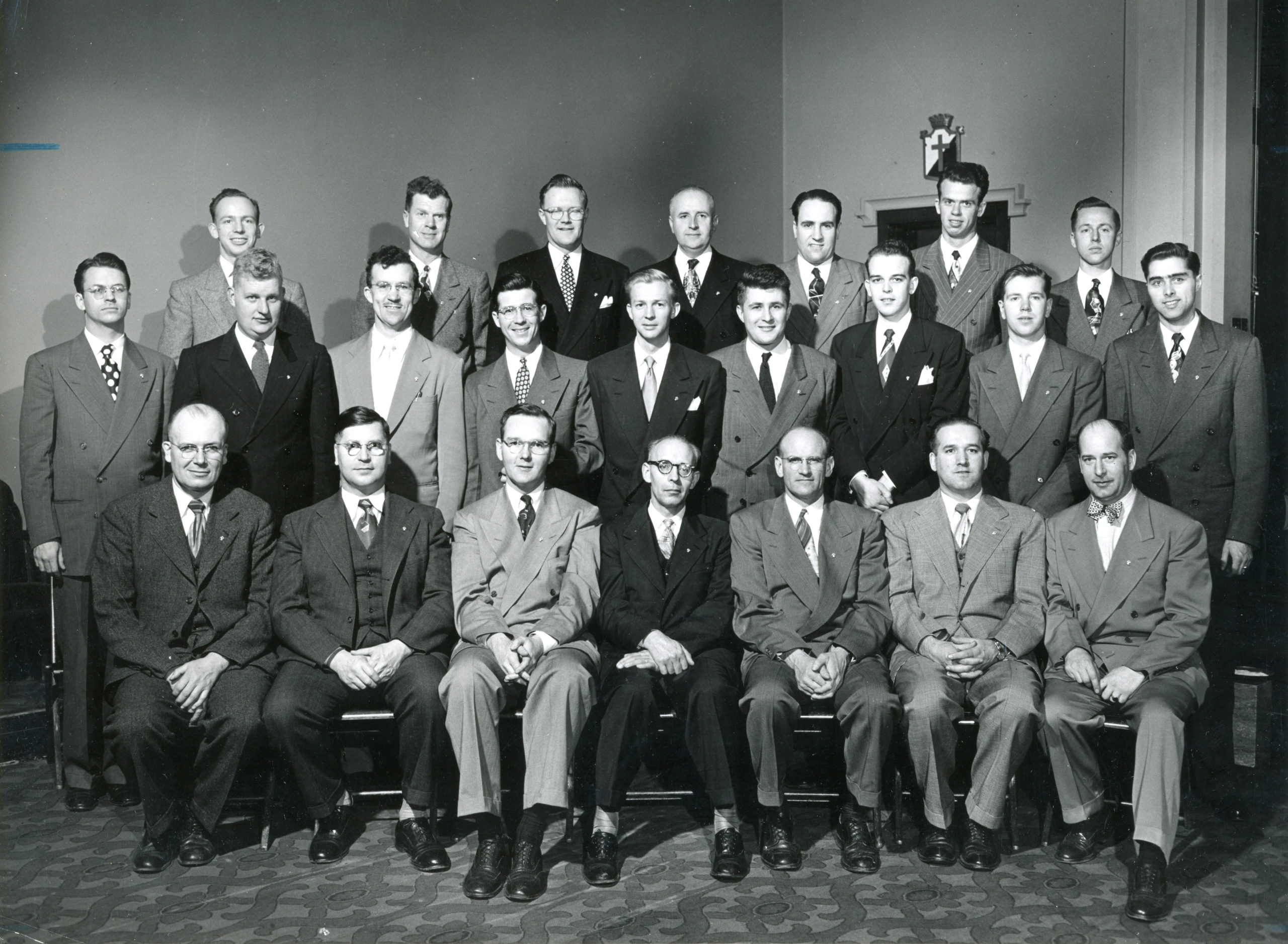 Twenty-six Sigma Mu Chi local alumni, 23 of whom appear in the photo, return to become Sigma Chis on February 4, 1950. (Sigma Chi Fraternity Archives)
