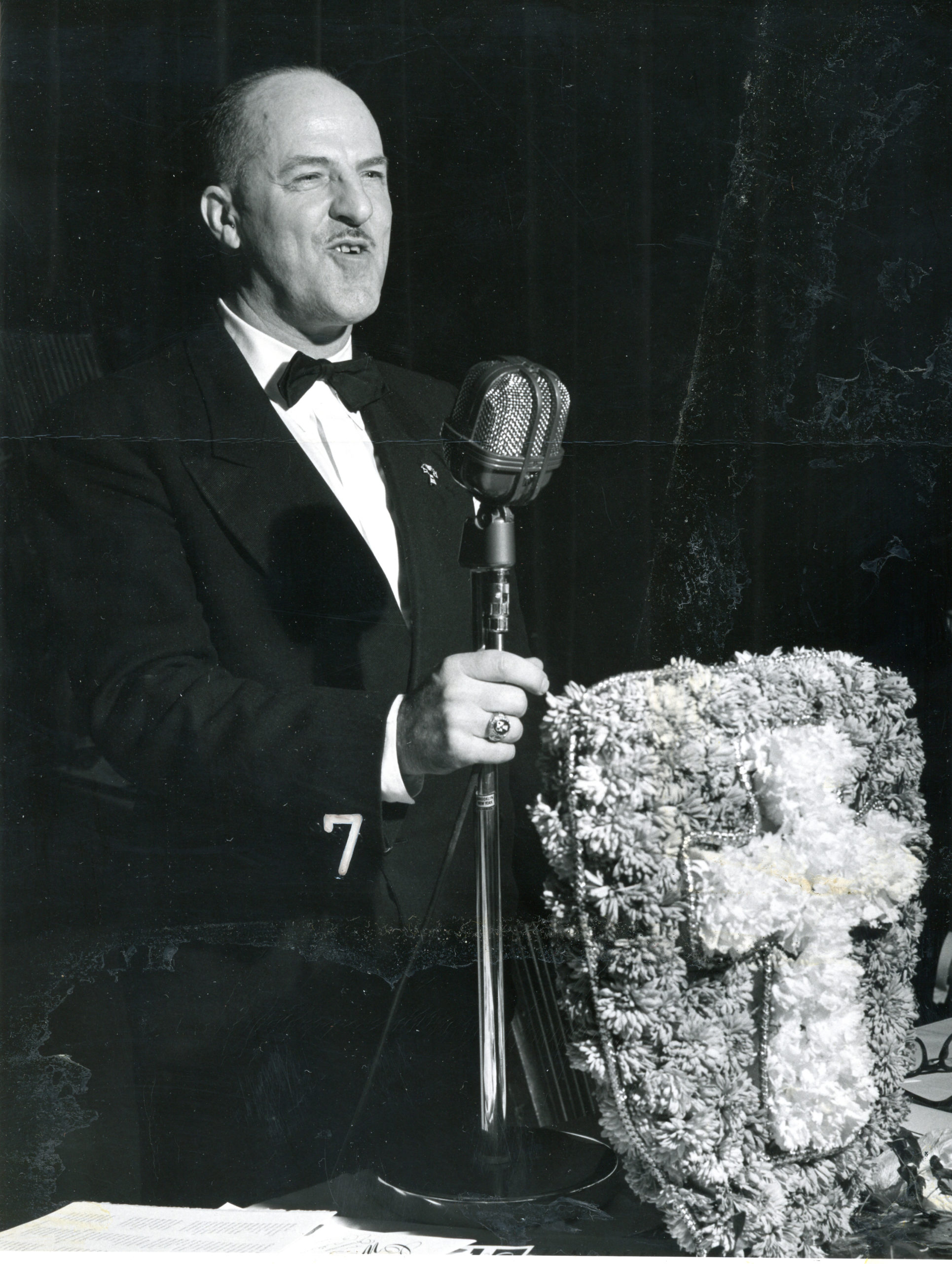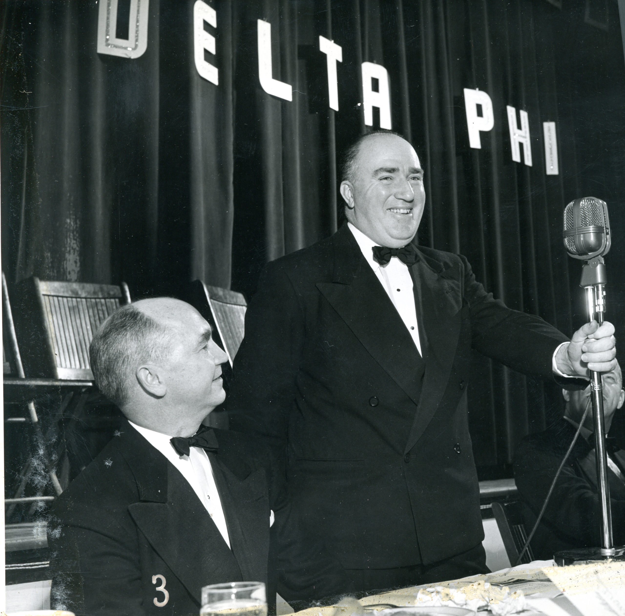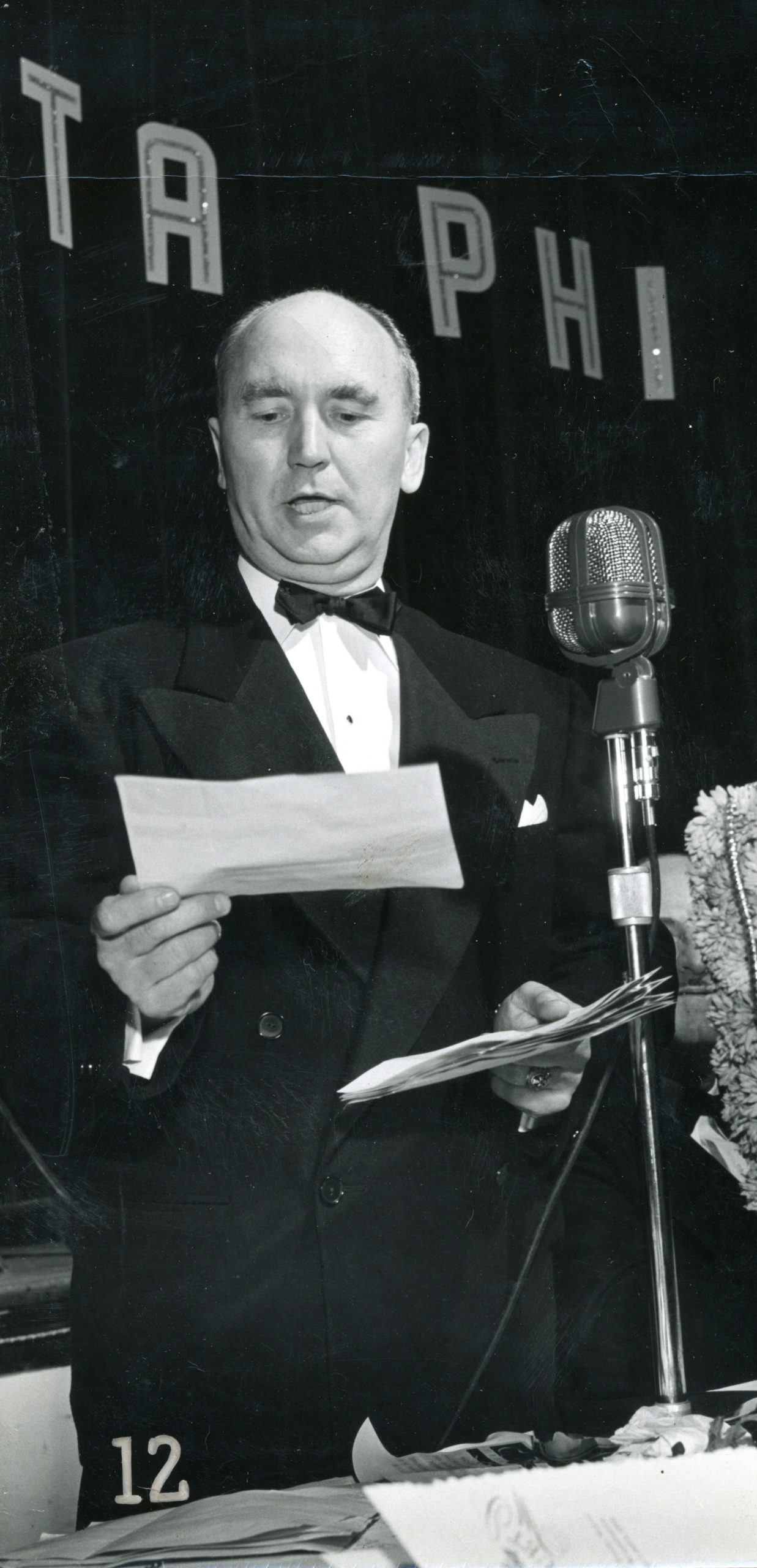 “To bring new luster to the White Cross,” is the goal Sam C. Bullock, executive director of the Sigma Chi Fraternity, set for the Delta Phi Chapter at the Installation Banquet on February 4, 1950. (Sigma Chi Fraternity Archives)