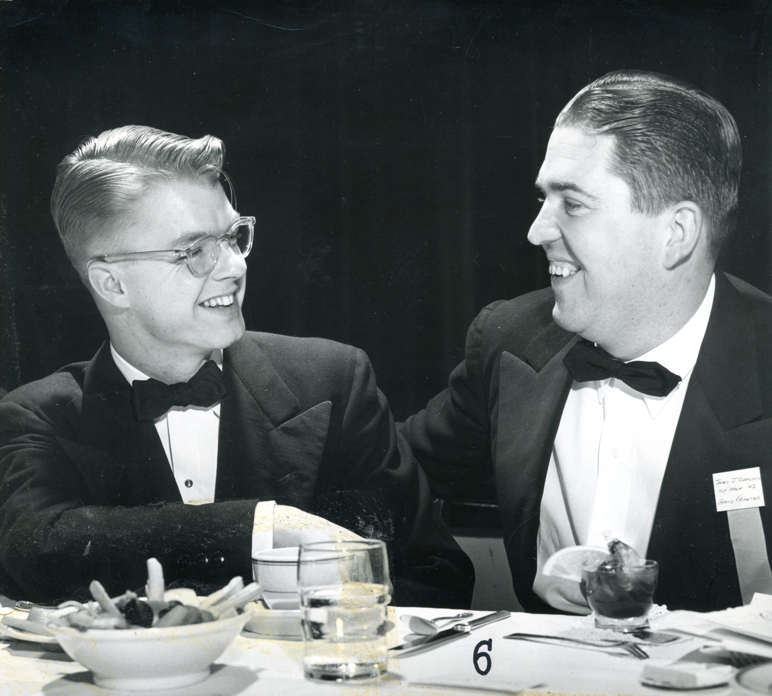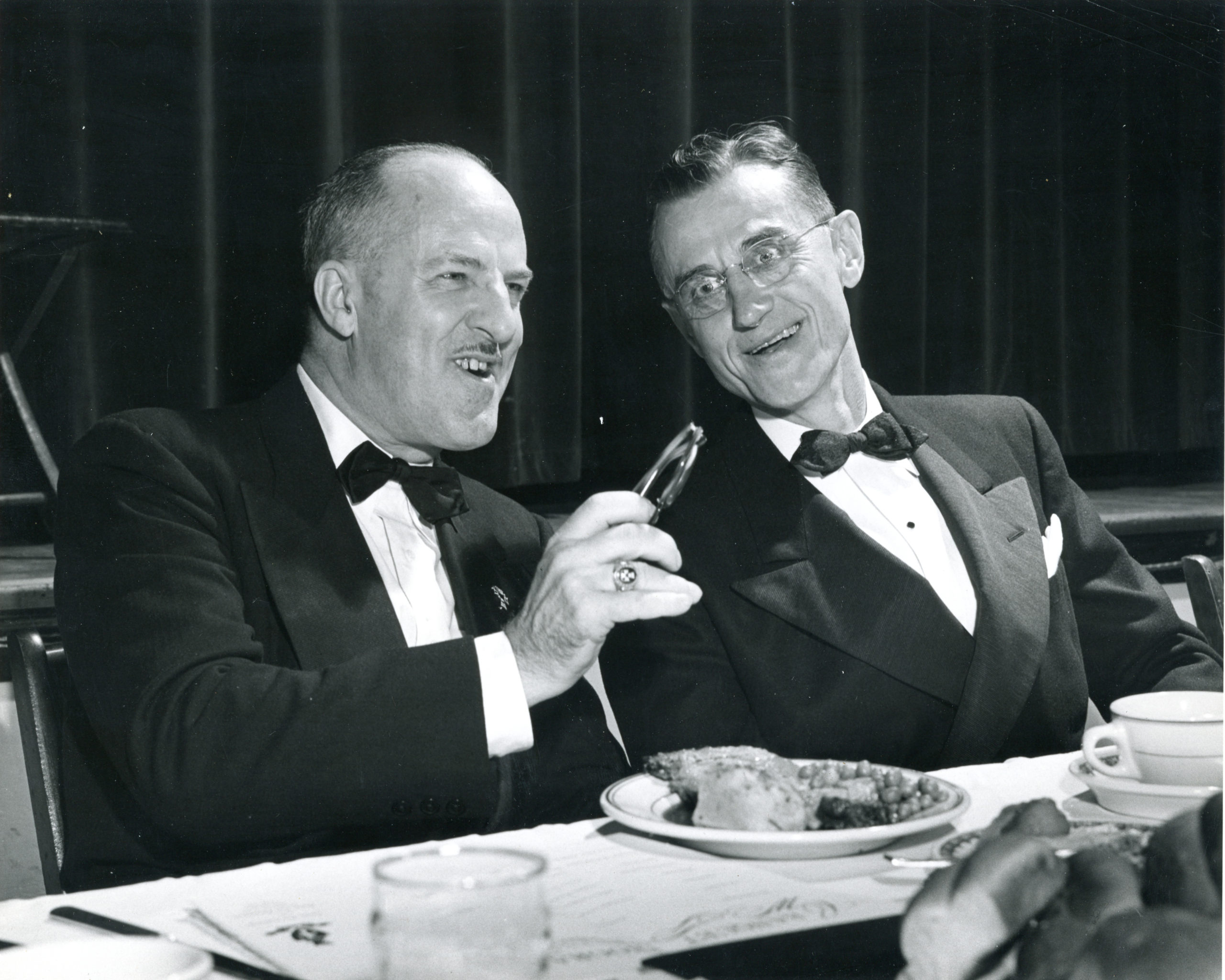 Executive Director Sam C. Bullock and Dr. J. Dwayne Reitz (Beta Tau, Colorado State 1930) converse at the Installation Banquet on February 4, 1950. (Sigma Chi Fraternity Archives)