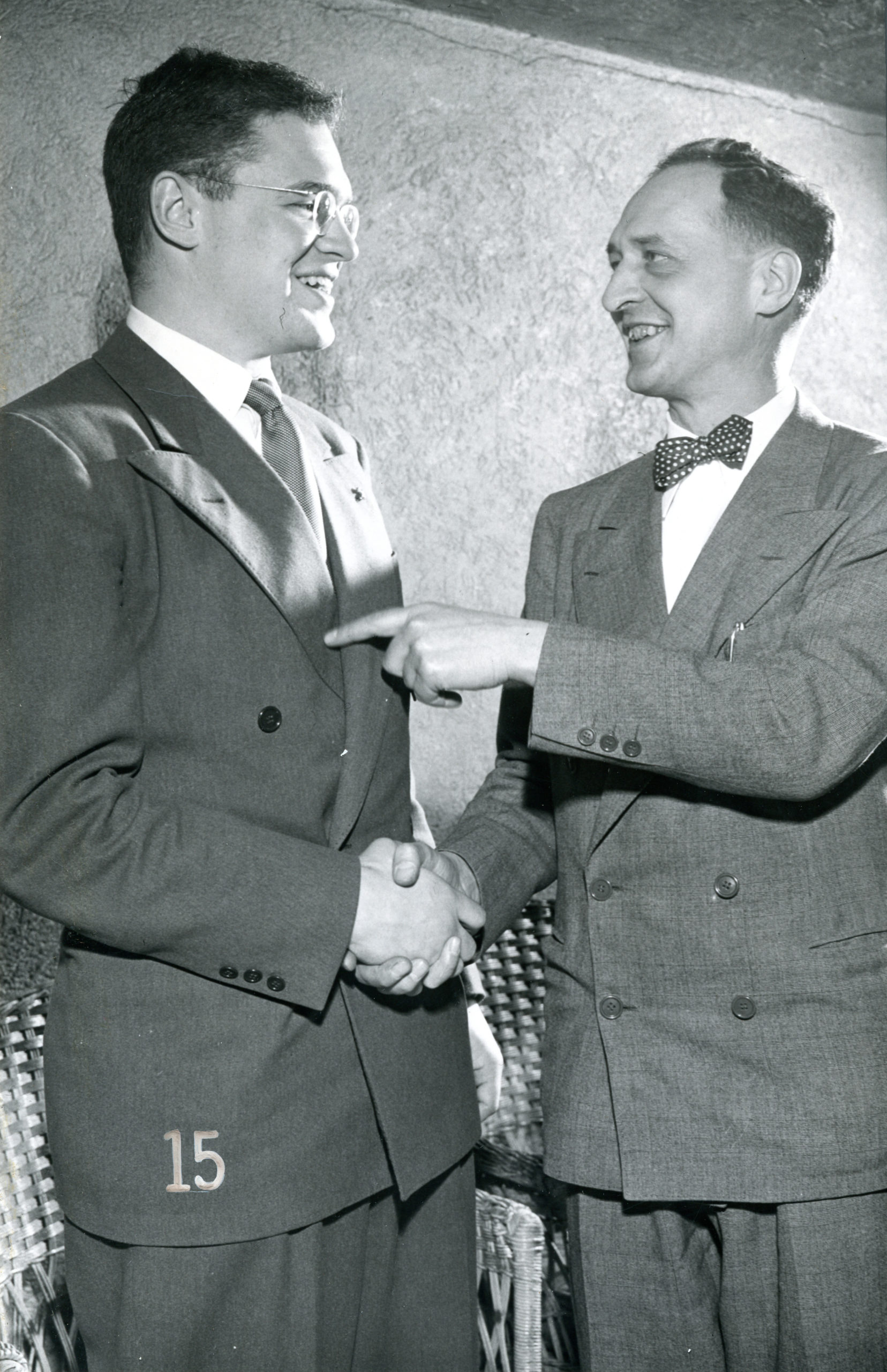 Grand Praetor James J. “Jim” Overlock tells Upsilon Upsilon Chapter Consul Fred J. Merritt Jr., “All the worrying was for naught,” at the Installation Banquet on February 4, 1950. (Sigma Chi Fraternity Archives)