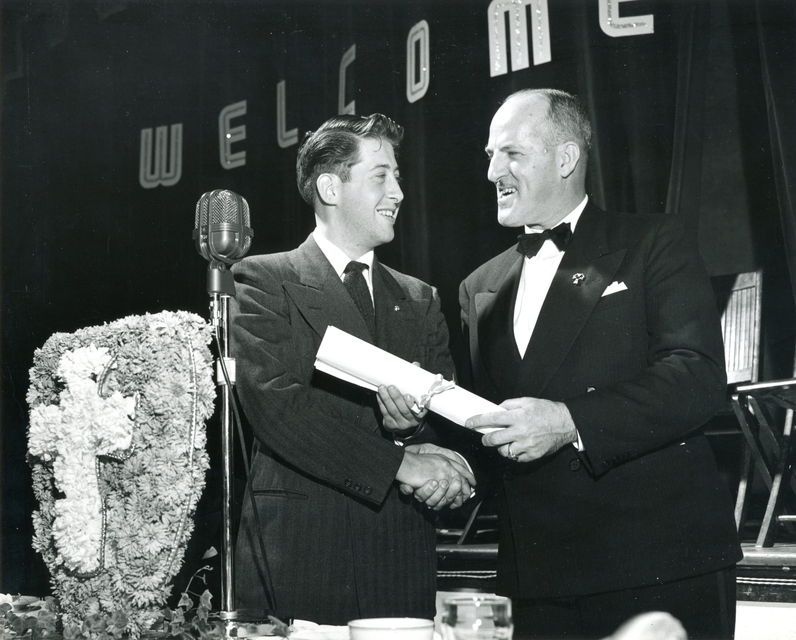 “We’re all behind you, Frank,” says John T. Steward (Gamma Eta, Idaho 1935), chairman of the installation committee, to Consul Frank H. Taylor Jr. at the Installation Banquet on February 4, 1950. (Sigma Chi Fraternity Archives)