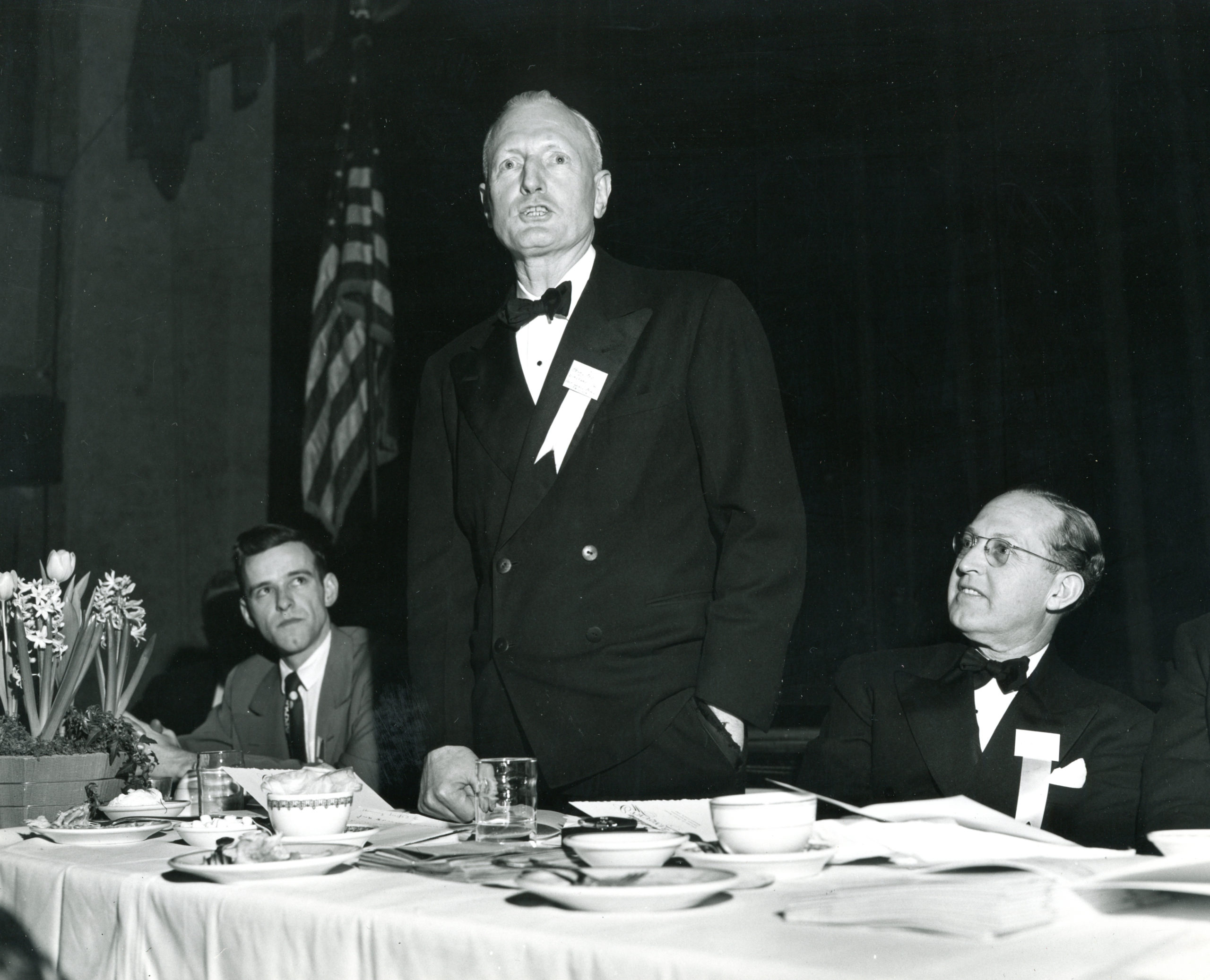 An unidentified Sig and Executive Secretary J. Russell Easton listen to Past Grand Praetor Henry O. Foss speak at the Installation Banquet on February 4, 1950. (Sigma Chi Fraternity Archives)