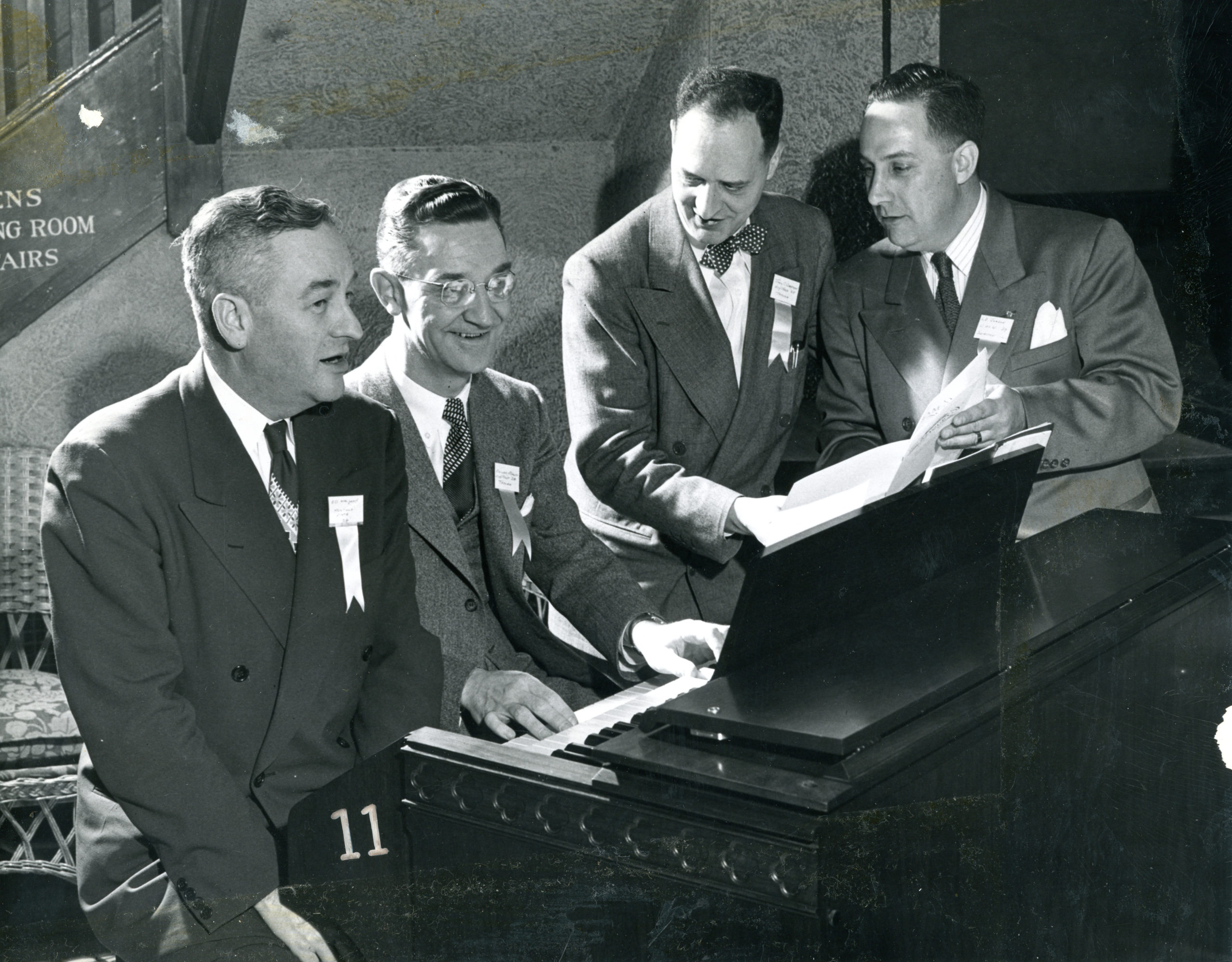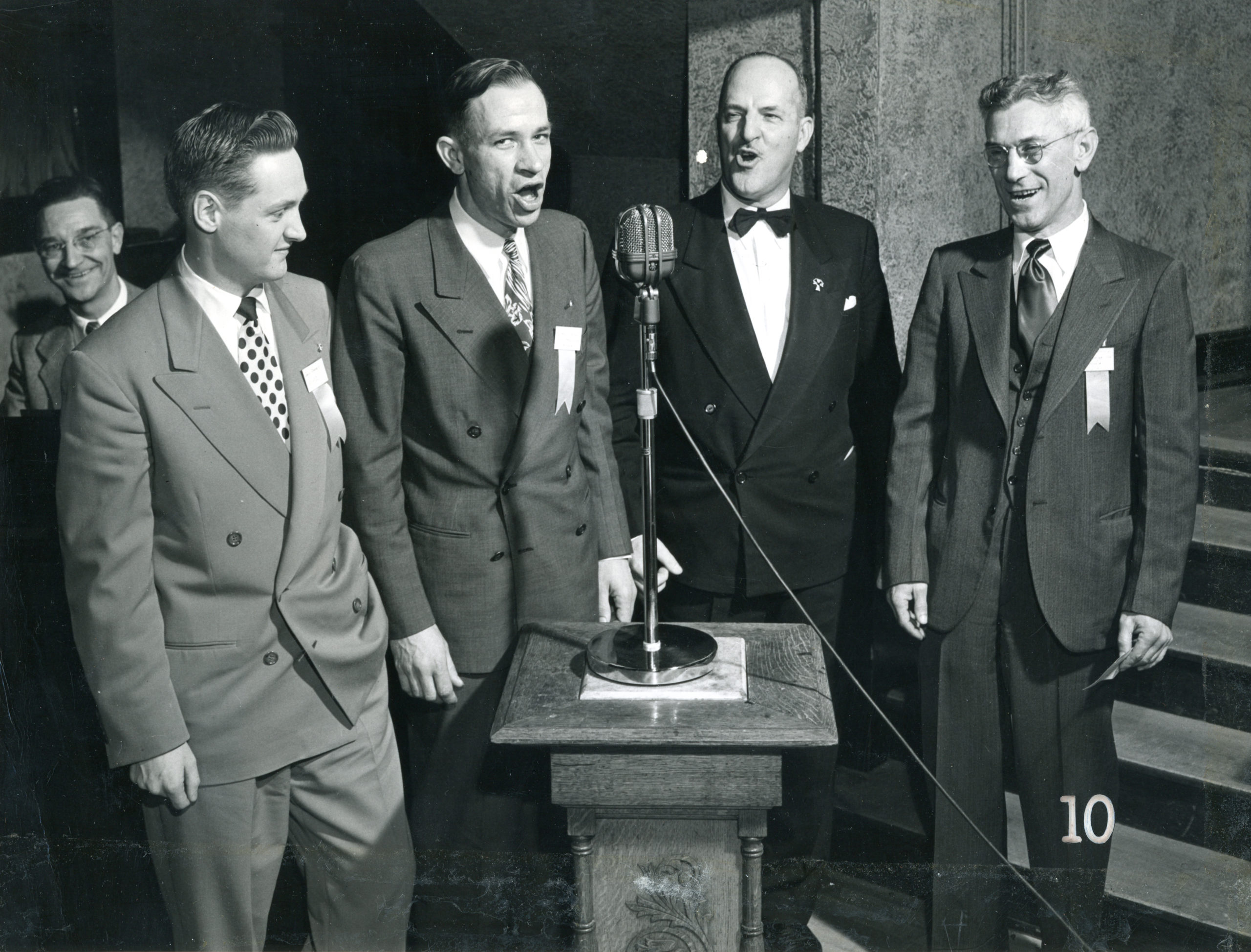 “She’s the Sweetheart of Sigma Chi,” sing Jack Babbit, College of Puget Sound senior; John Espy Jr. (Beta Iota, Oregon 1938); Sam C. Bullock, executive director; and Ralph G. Stowe (Beta Delta, Montana 1924). (Sigma Chi Fraternity Archives)