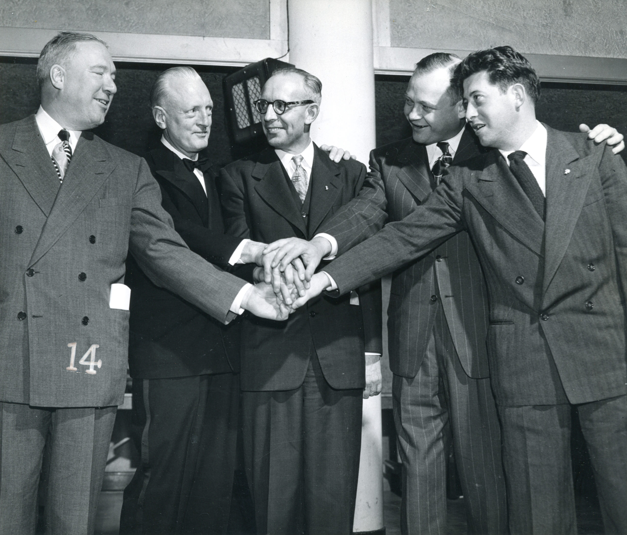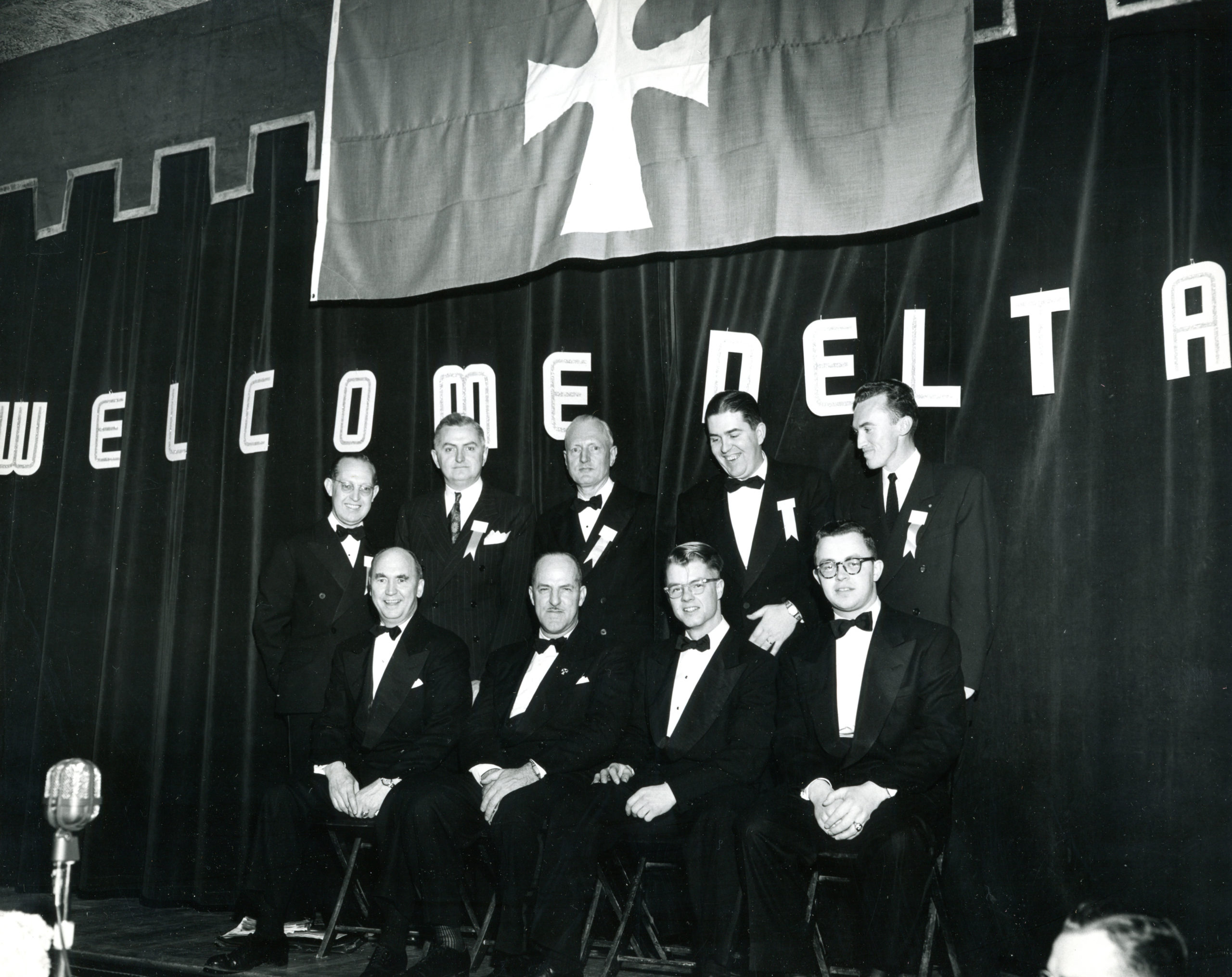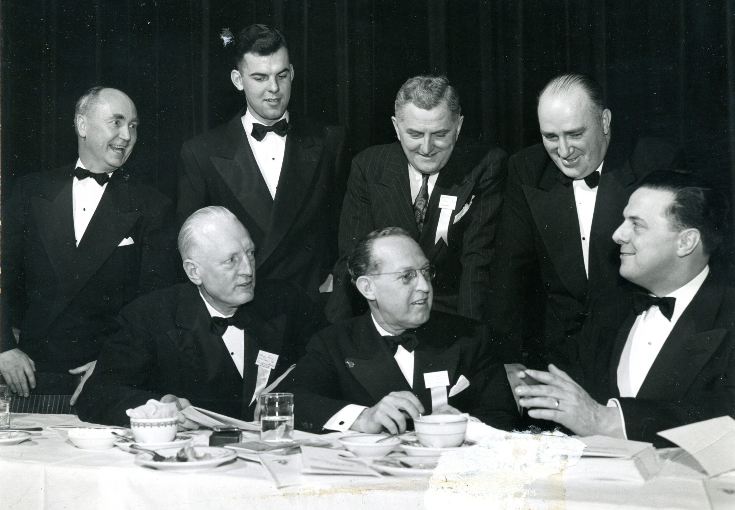 Installation officers gather on the dais for a photograph at the Installation Banquet on February 4, 1950. Front row: George Boldt; Sam C. Bullock, executive director of the Sigma Chi Fraternity; Fred Merritt; and Merrill E. Prichard, editor of the Magazine of Sigma Chi. Back row: Russ Easton; Don Meyer; Past Grand Praetor Henry O. Foss; Grand Praetor James J. “Jim” Overlock; and Field Secretary James L. Young. (Sigma Chi Fraternity Archives)