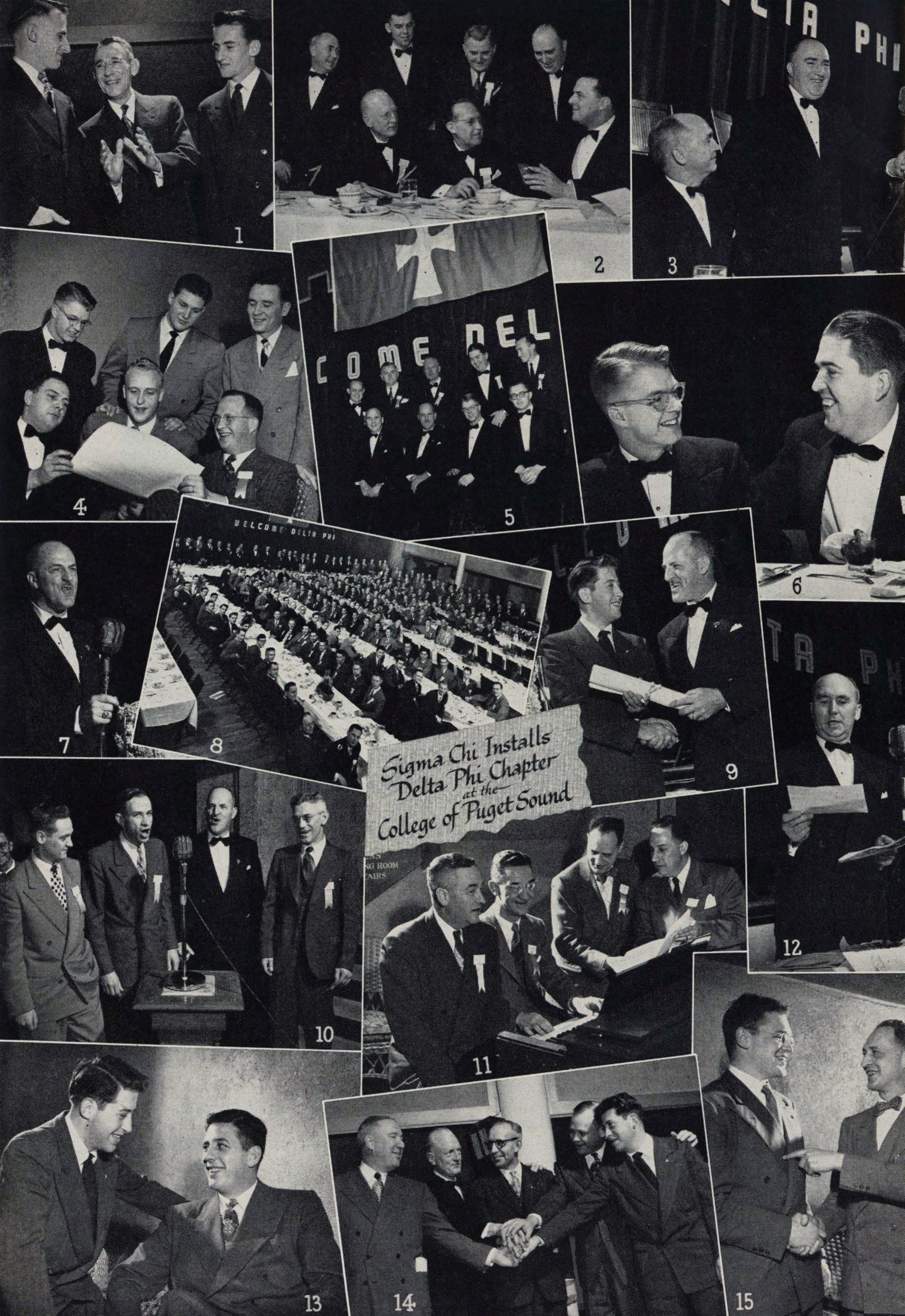 A collage of photographs taken at the Installation Banquet appeared in the May 1950 issue of the Magazine of Sigma Chi. (Sigma Chi Fraternity Archives)