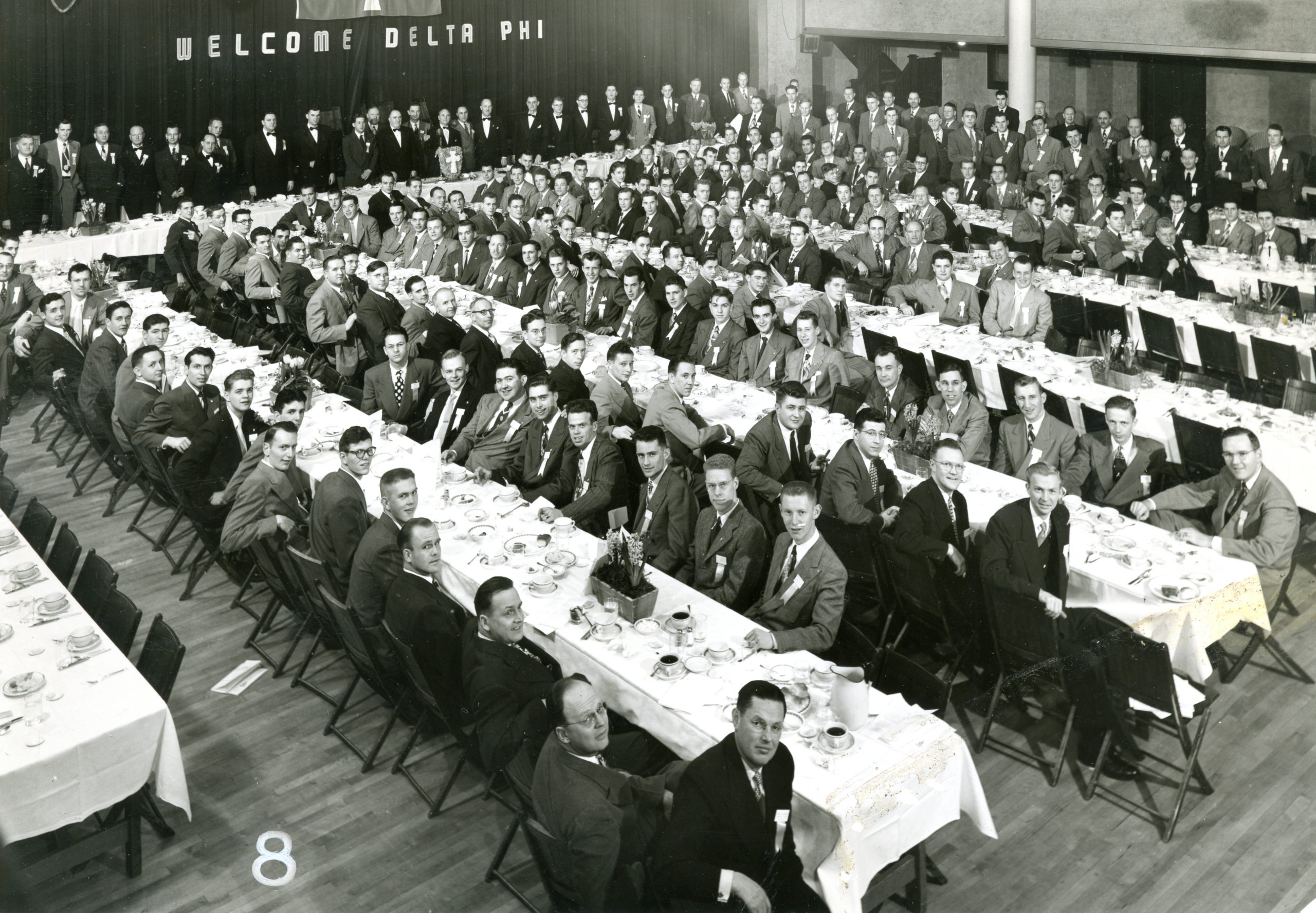 Nearly 300 guests attend the Installation Banquet on February 4, 1950, in the Fellowship Hall of the Tacoma Masonic Temple. (Sigma Chi Fraternity Archives)