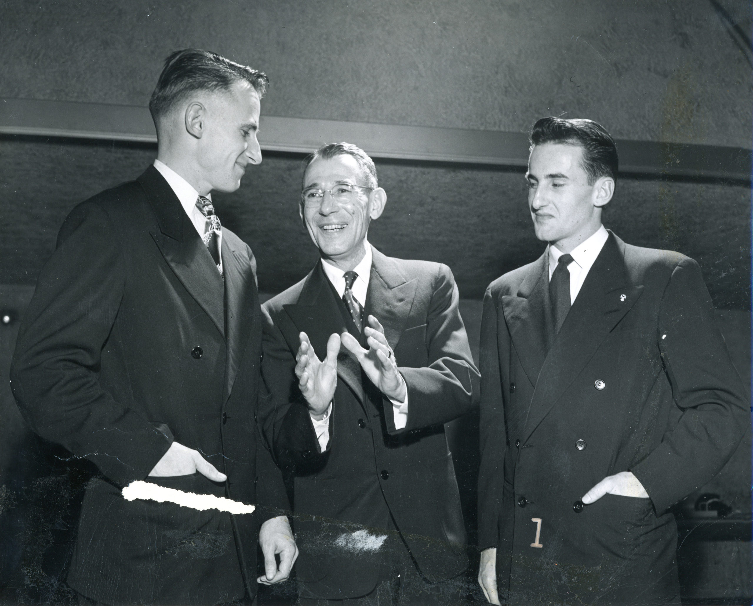 Donald I. Plummer (Upsilon Upsilon, Washington 1920), center, tells his Sig sons, Don Jr. (Upsilon Upsilon, Washington 1945) and Bill (Delta Phi, Puget Sound 1951), how his chapter operated in his day at the Delta Phi Chapter Installation Banquet on February 4, 1950. (Sigma Chi Fraternity Archives)