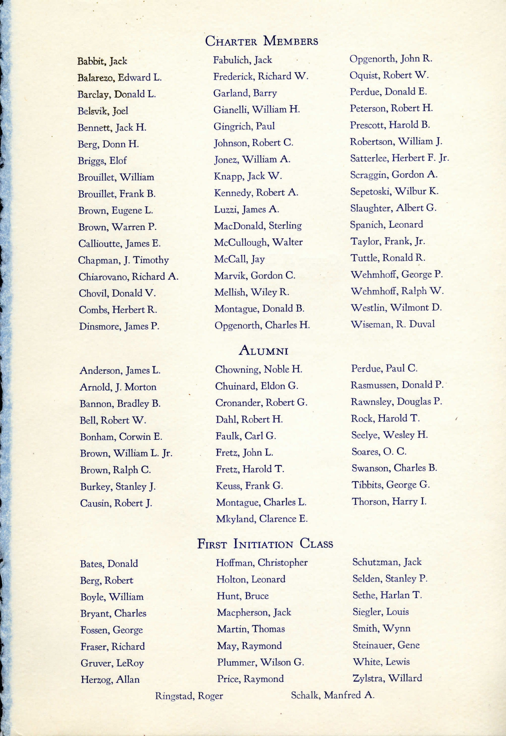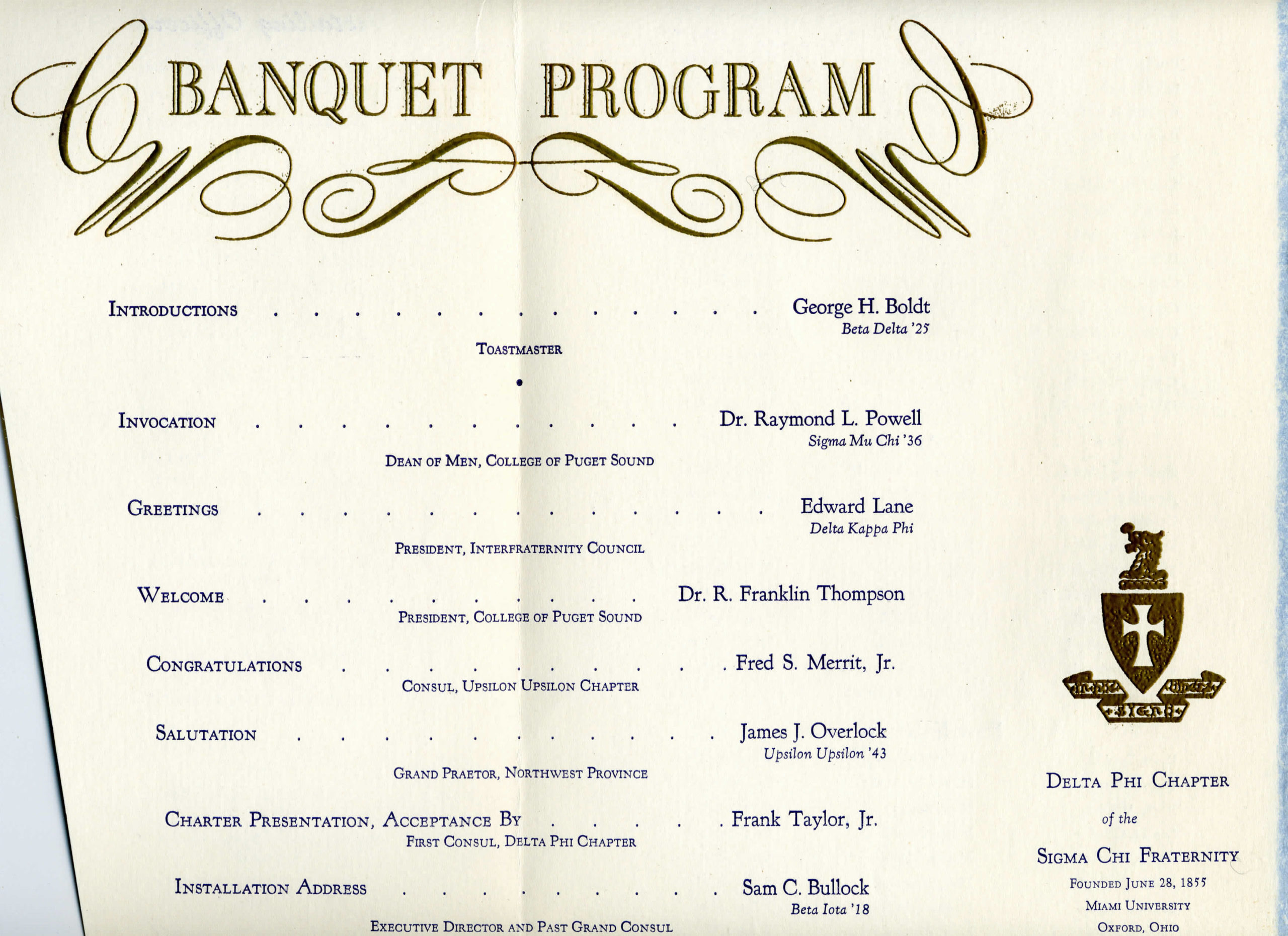 The brothers of the Tacoma Alumni Chapter and the Upsilon Upsilon Chapter at University of Washington played an important role in the installation of and initiation of the first brothers of Delta Phi Chapter at University of Puget Sound over the weekend of February 4 – 5, 1950.