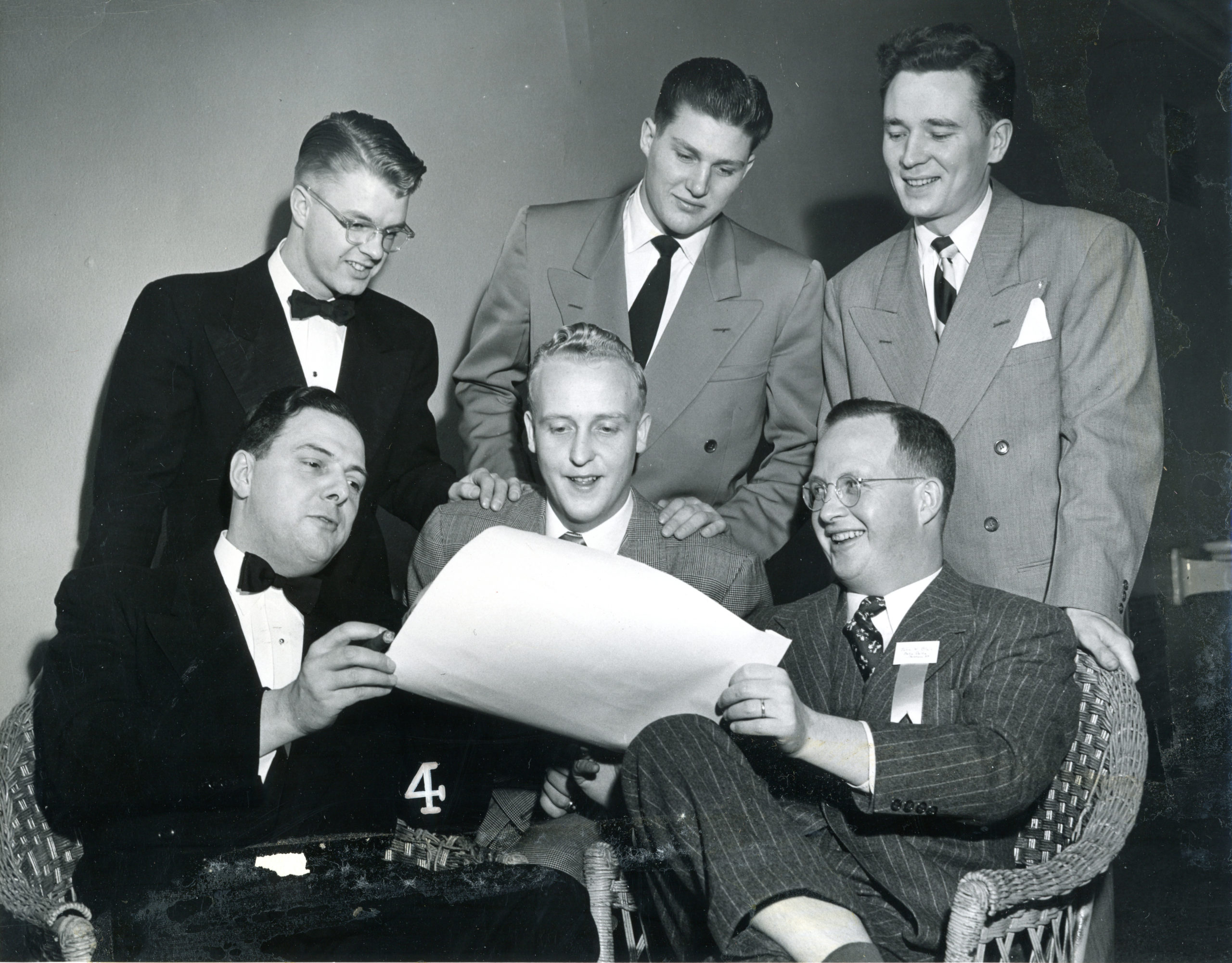 Key men in the effort to pay off the Delta Phi Chapter mortgage huddle at the Installation Banquet on February 4, 1950: Clifford M. Langhorne (Upsilon Upsilon, Washington 1924), Past Grand Praetor Henry O. Foss, Harold T. Foss (Delta Phi, Puget Sound 1924), charter member of Sigma Mu Chi local; Archie F. Blair (Beta Delta, Montana 1925); and Consul Frank H. Taylor Jr. (Delta Phi, Puget Sound 1950). (Sigma Chi Fraternity Archives)
