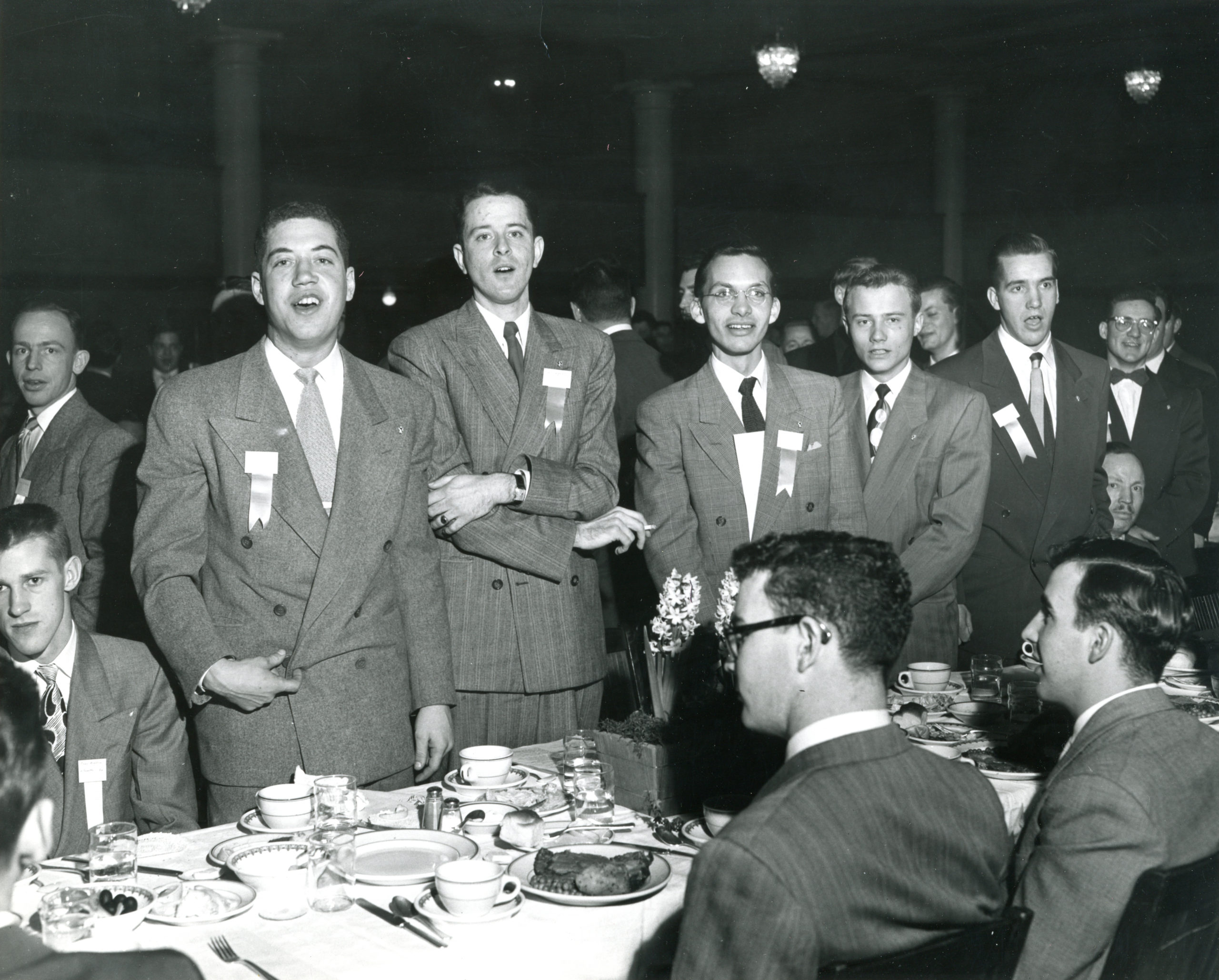 Sigs sing while Oliver Malm (Beta Delta, Montana 1928) plays the Hammond organ, provided as a courtesy by Sherman Clay & Co., at the Installation Banquet on February 4, 1950. (Sigma Chi Fraternity Archives)