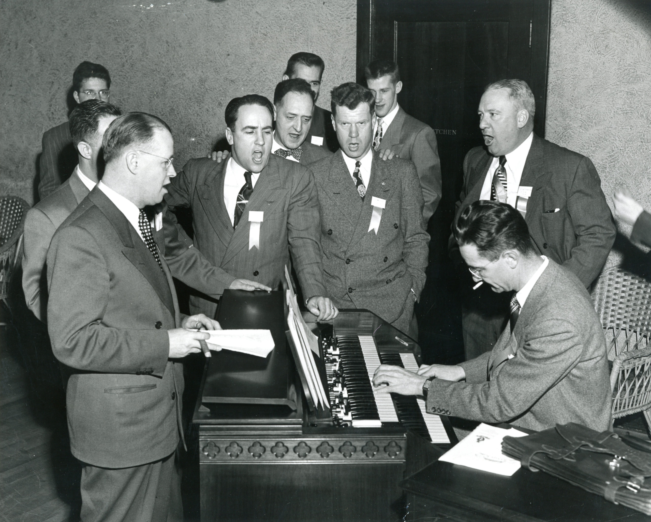 Edgar B. MacLeod (Beta Rho, Montana State, and Alpha Epsilon, Nebraska 1926), John C. Chapman (Upsilon Upsilon, Washington 1925) and L. S. Jordan (Upsilon Upsilon, Washington 1929) sing while Oliver Malm (Beta Delta, Montana 1928) plays the Hammond organ, provided as a courtesy by Sherman Clay & Co., at the Installation Banquet on February 4, 1950. (Sigma Chi Fraternity Archives)